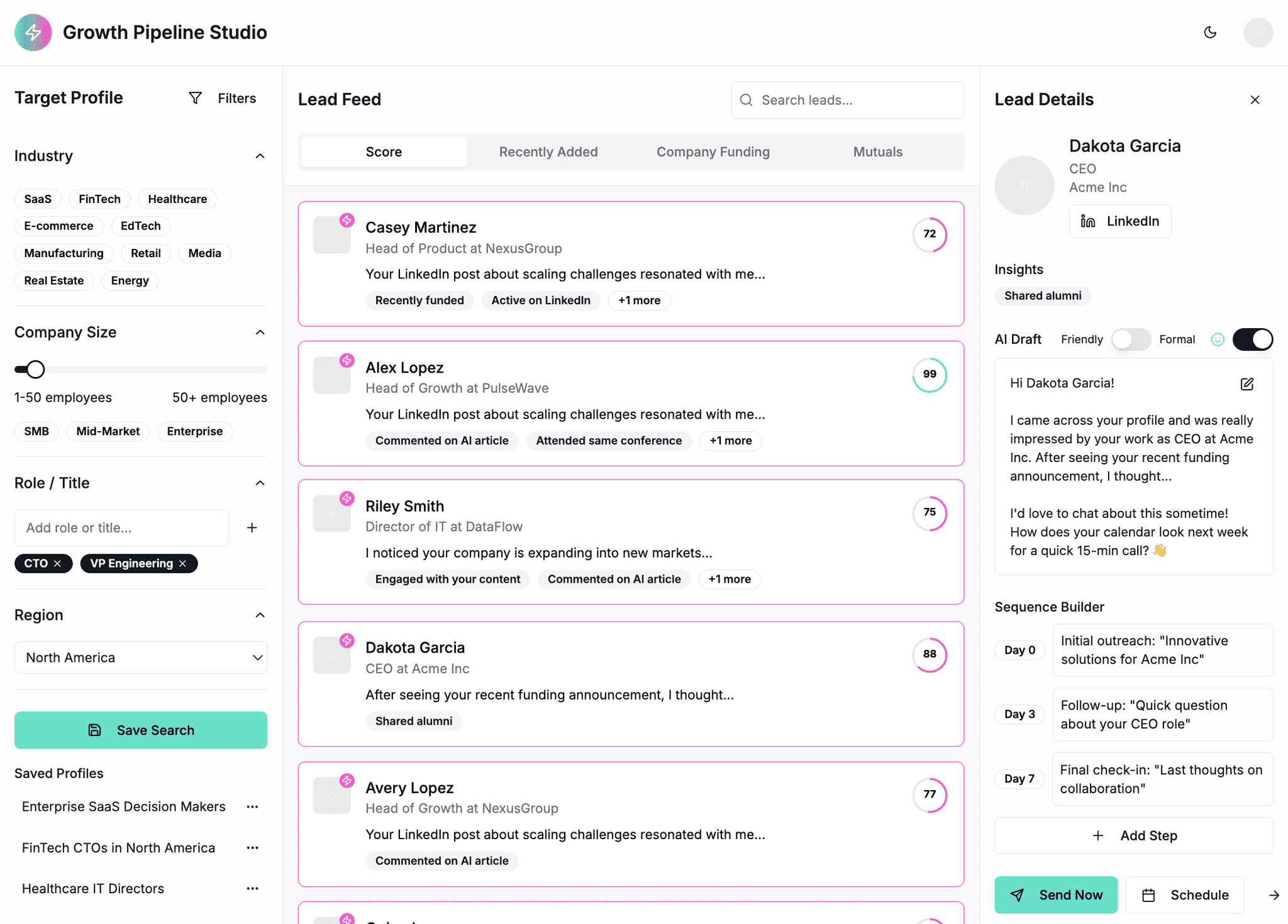 The system continuously scans lead databases, LinkedIn and news sources to surface fresh prospects, enriches each record with hooks, then drafts personalised e-mails and follow-ups. Sales focus on fine-tuning messages and booking meetings,not list-building and enrichment